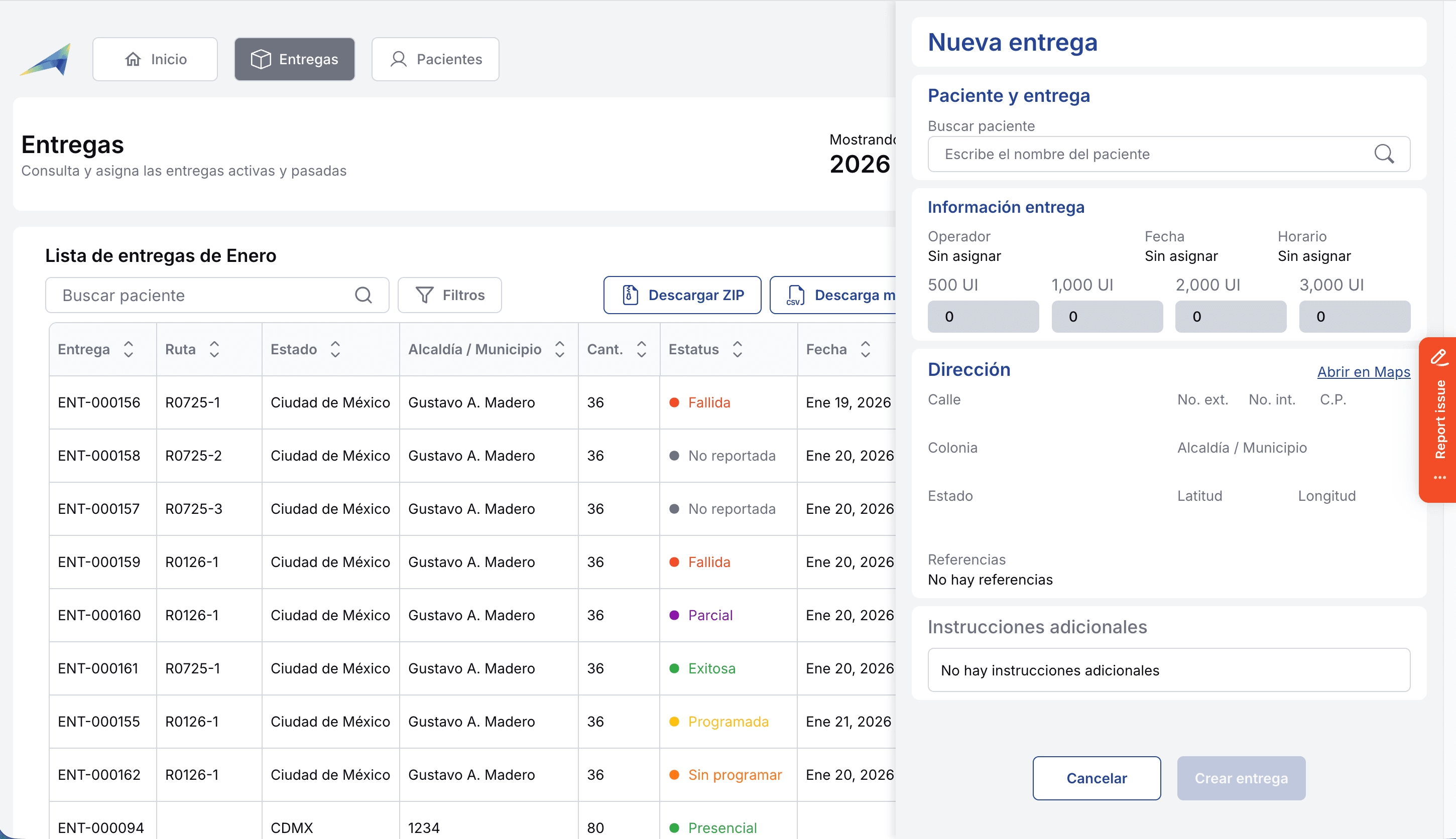 Es tu panel principal para consultar y asignar las entregas activas y pasadas. Está diseñada para darte visibilidad total de un solo vistazo.
